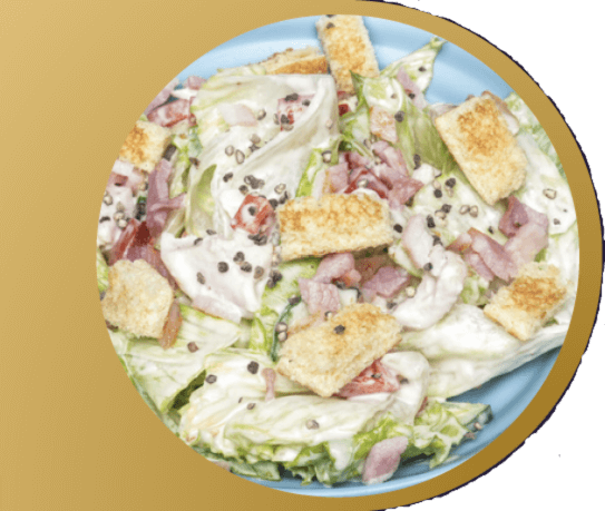 Fresh oven-baked chicken served on a bed of lettuce, cucumber, tomato and red pepper, topped with smoky bacon and parmesan, tossed in Caesar dressing and garnished with croutons.