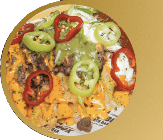 Skin on fries topped with slow cooked mince beef, cheese sauce, sweet red pepper, spring onion, green chilli and sesame seed(GF)